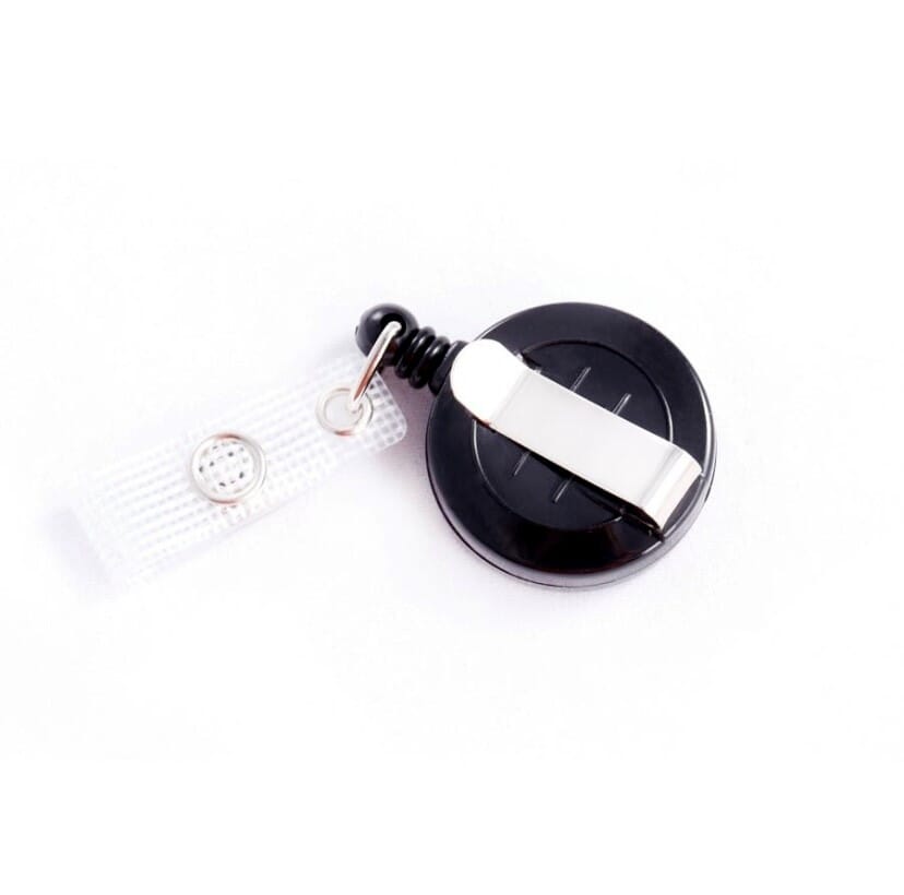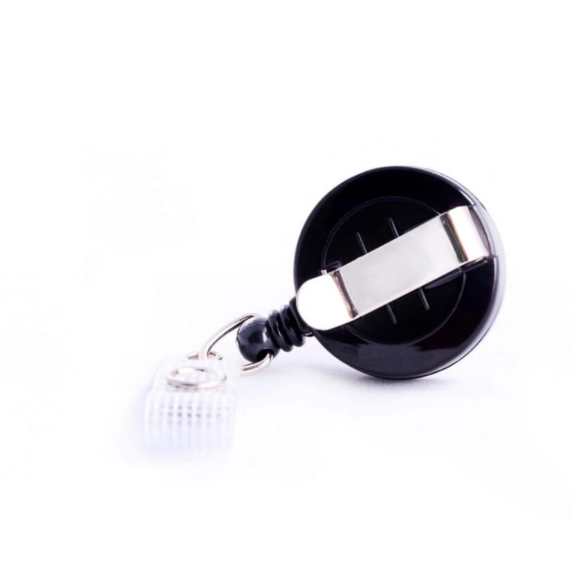 Black Retractable Reel with belt clip, nylon cord and reinforced vinyl strap.