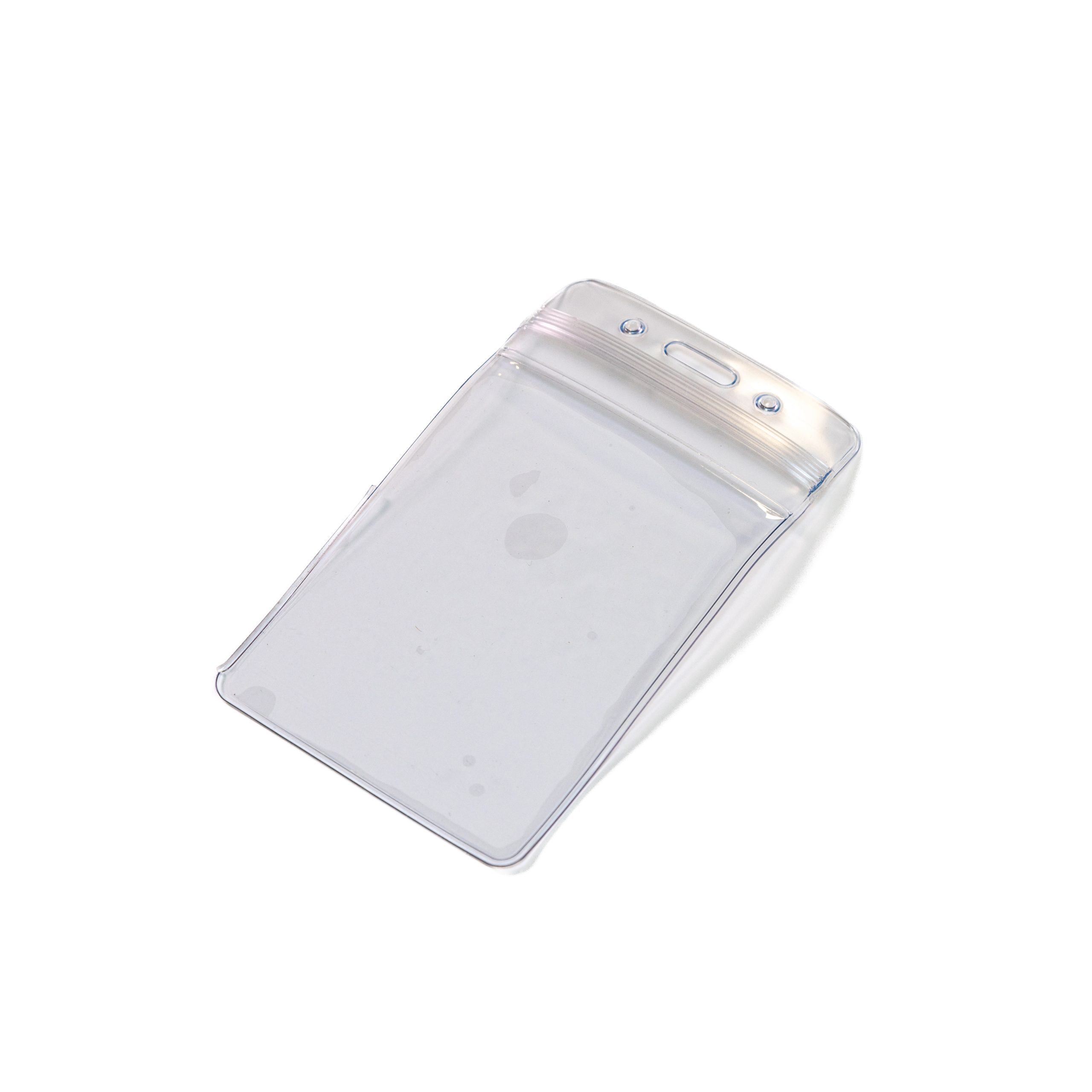 Clear portrait flexible zip lock ID card holder with a slot in the center and one hole either side of the slot.