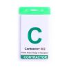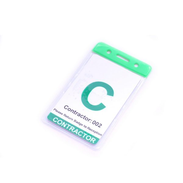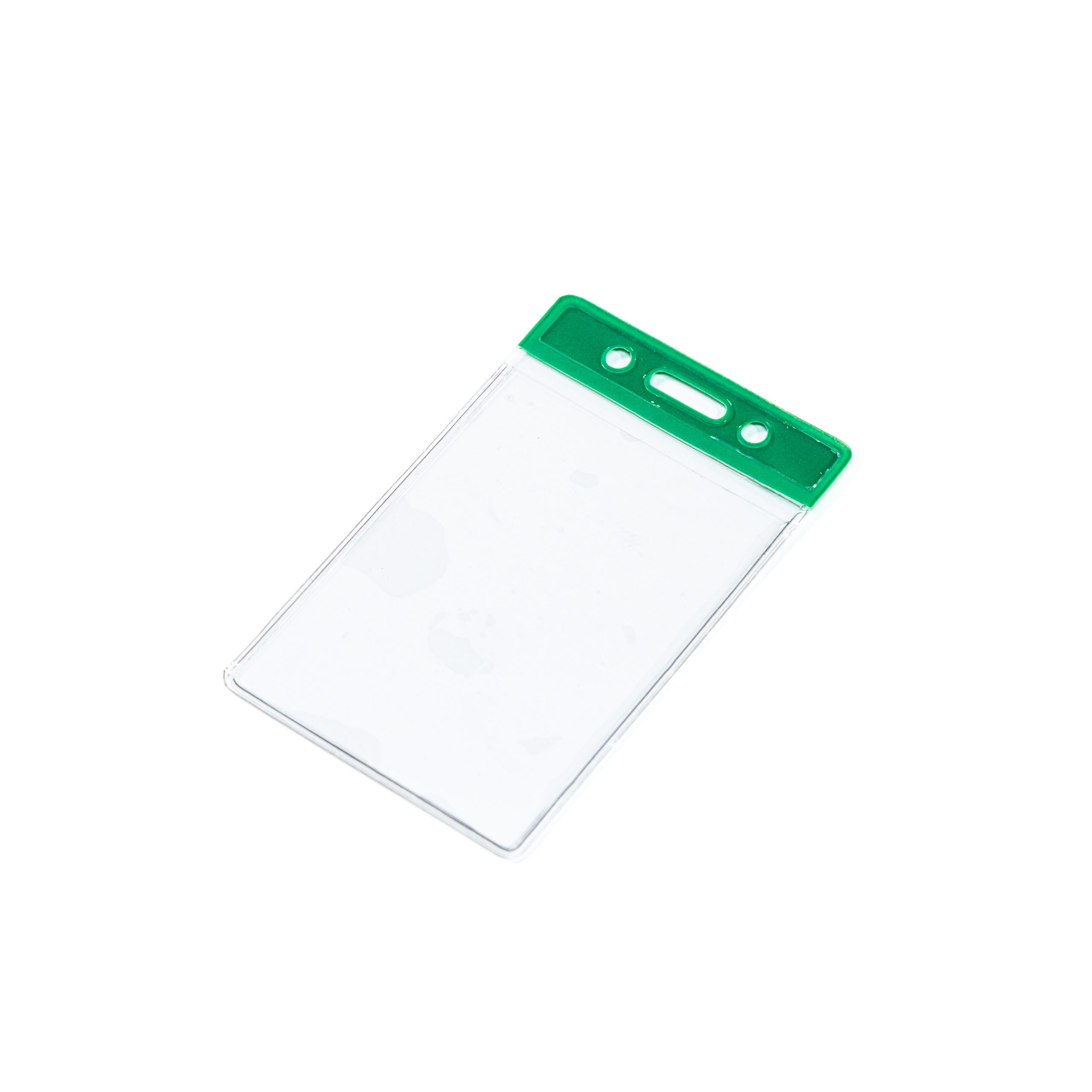 Economy clear portrait flexible ID card holder with a green top, a slot in the centre and one hole either side of the slot.