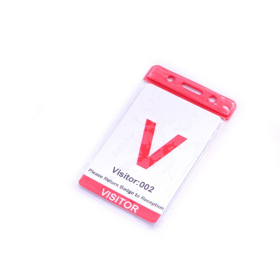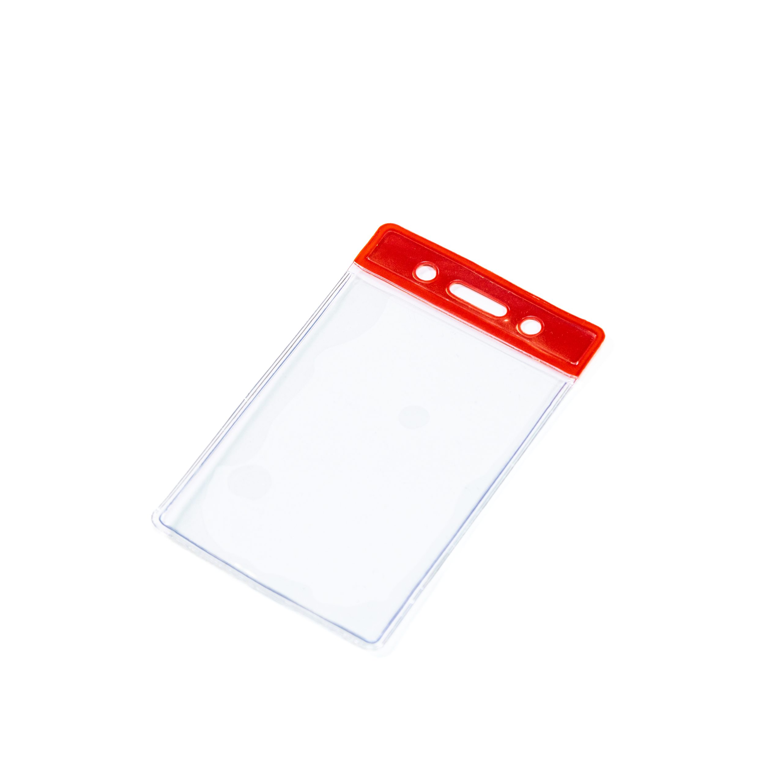 Economy clear portrait flexible ID card holder with a red top, a slot in the centre and one hole either side of the slot.
